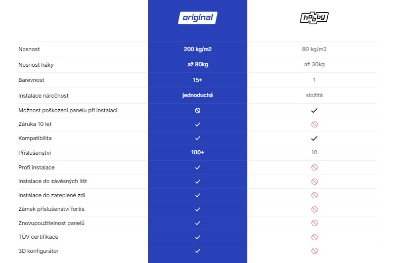 Rad Reponio Hobby je navrhnutý predovšetkým pre tých, ktorí chcú lacný závesný systém. To znamená, že Hobby neponúka takú nosnosť, výber farieb panelov alebo profesionálne príslušenstvo. Závesný systém Hobby si však hravo poradí so všetkými predmetmi, ktoré máte doma. Závesný systém Reponio Original je špičkové riešenie, najlepšie svojho druhu na svete. Je to jediný systém s garantovanou nosnosťou až 200 kg na m2 a jedinečným lock systémom Fortis, ktorý udrží príslušenstvo aj s predmetmi v pevnej polohe.