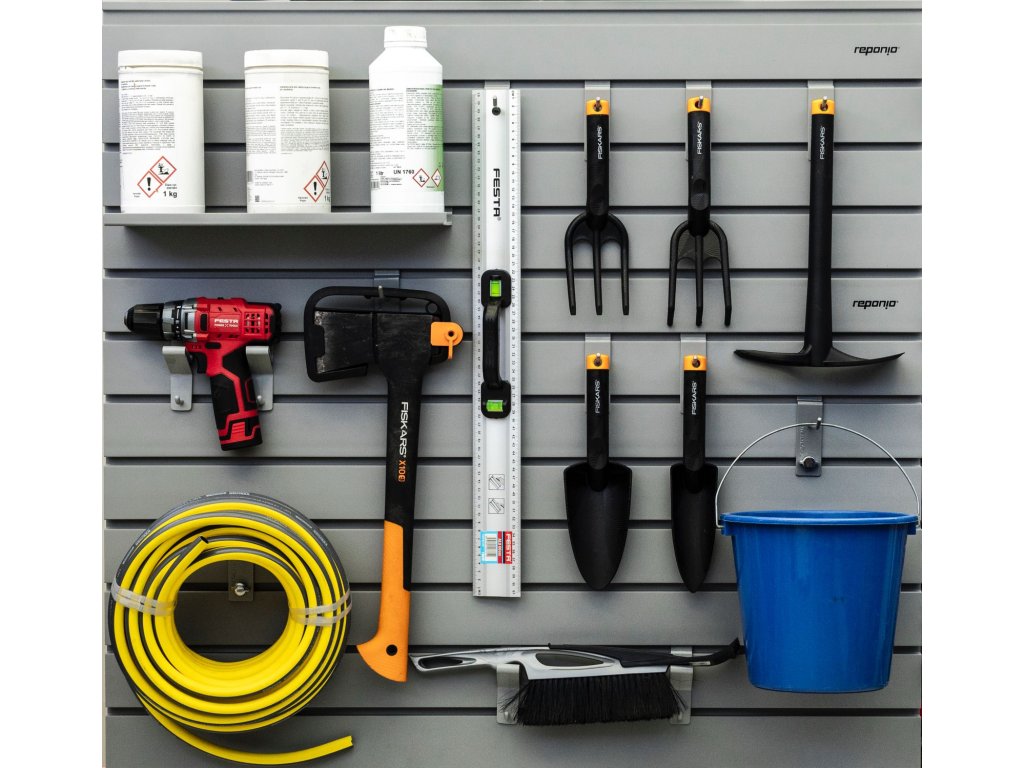 Tato sada vám umožní pověsit základní vybavení – ruční nářadí, zahradní potřeby, prodlužovačky, drobnosti a další. Získáte více místa, lepší přehled a konec hledání v chaosu.
